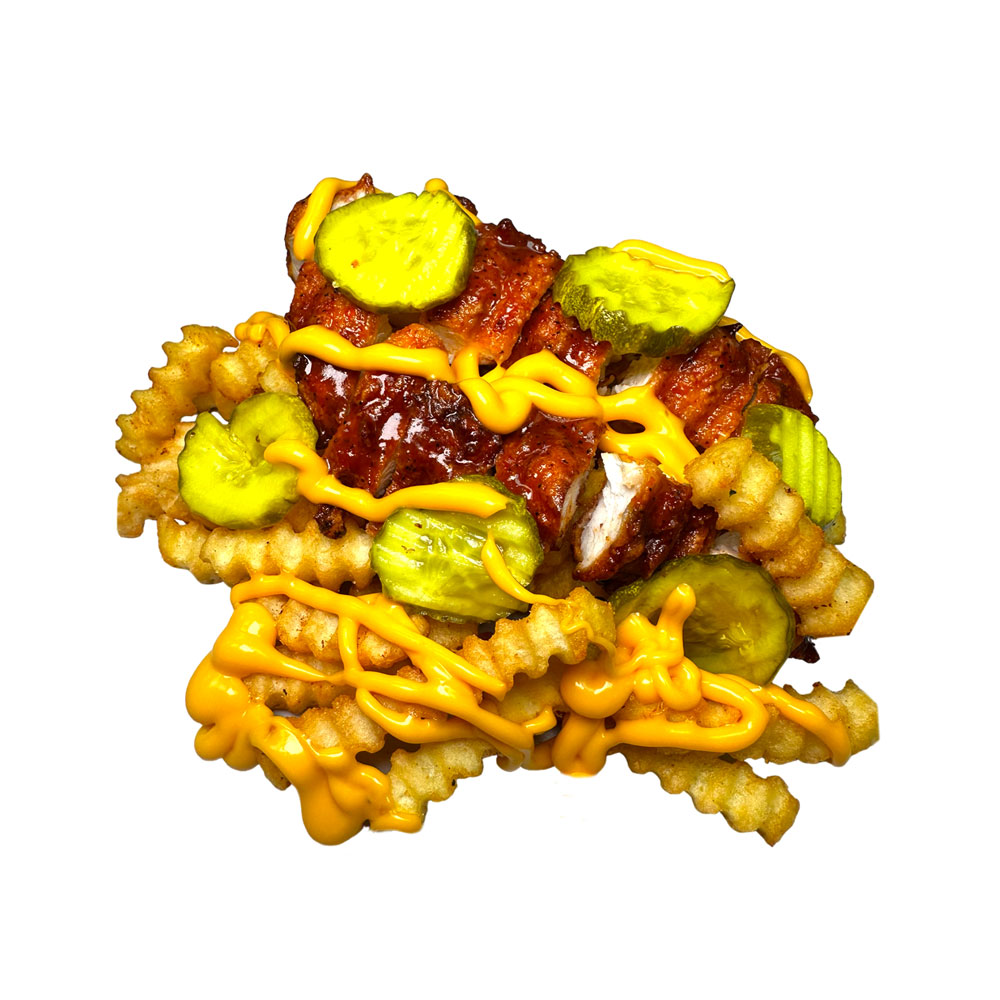 Chopped Nashville hot fried chickie tendie with cheddar cheese, pickles, Lucky’s Honey Sauce