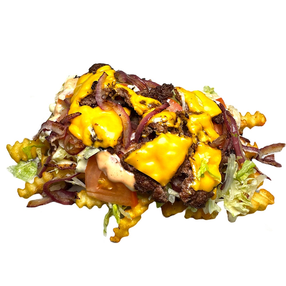 Chopped burger patty with grilled onions, lettuce, cheddar cheese, lucky’s classic & garlic dijonnaise sauce